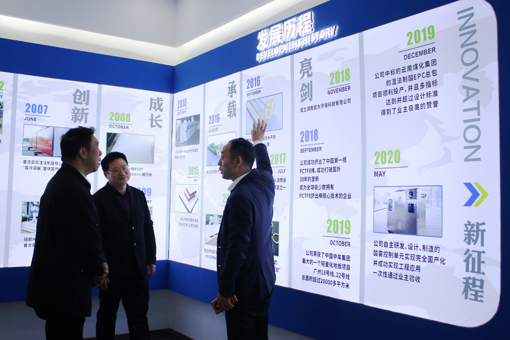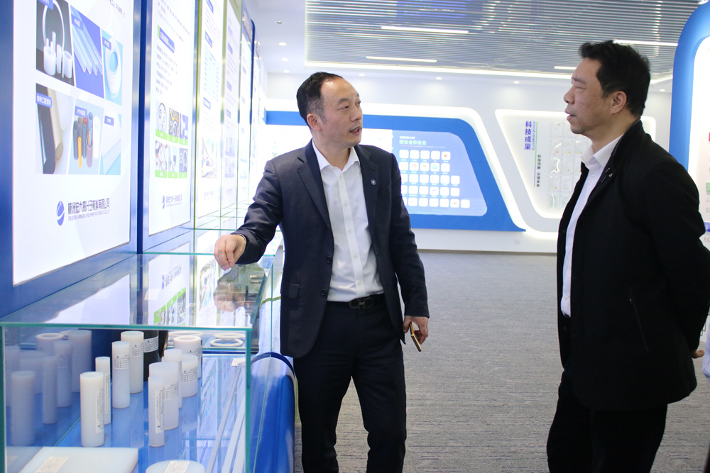 展廳內(nèi)觀看宏大企業(yè)宣傳片,董事長曾維楚向尹局長一行詳細(xì)介紹了宏大發(fā)展歷程,主要產(chǎn)品(高功能新材料半成品、特種密封件、輕量化復(fù)合材料、精密注塑件、水處理核心元件、環(huán)保裝備),產(chǎn)品核心技術(shù)及應(yīng)用案例。尹局長對宏大的技術(shù)研發(fā)和發(fā)展成果給予了高度肯定。